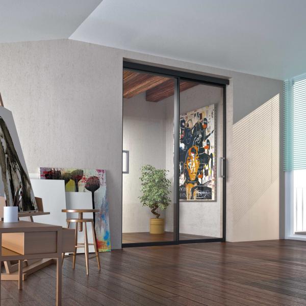 Linea mono vetro da 8 mm – scorrevole parallelo interno S 00 – alluminio sabbiato nero e vetro trasparente grigio