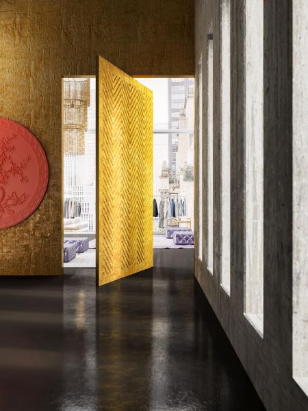 Porta a bilico verticale con superficie pantografata laccato opaco